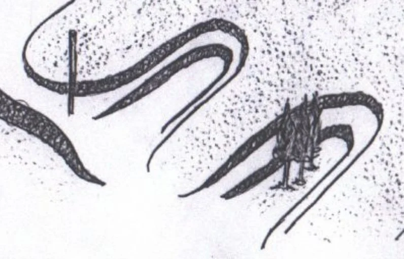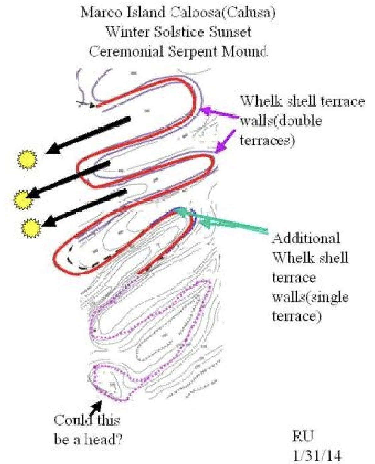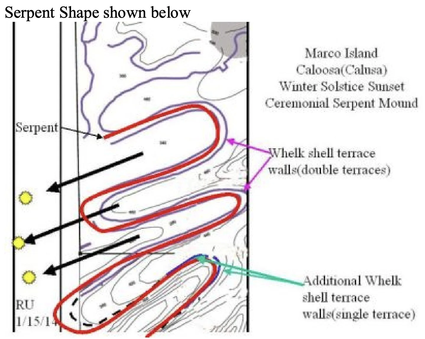 I had suspected that the Marco Island Serpent could have a head, so after Tom sent me this, I looked for a larger scale topographical view of the shell midden and found a view that went farther south. I outlined the serpent, including what most likely is, or was at one time, the head of the serpent.