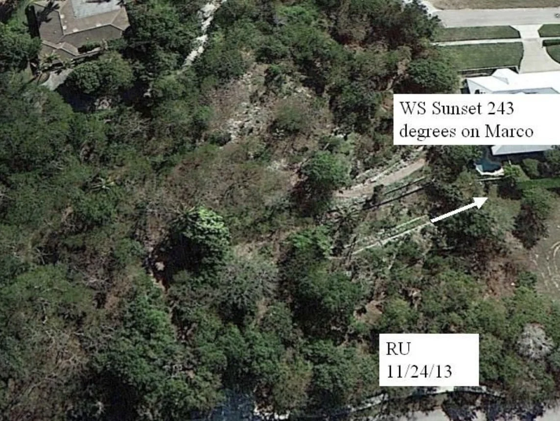Simulated Caloosa view of Sunset on Winter Solstice (unfortunately, there is now a house obstructing the view, and other houses in the distance on filled land that wasn’t there during the Caloosa period).