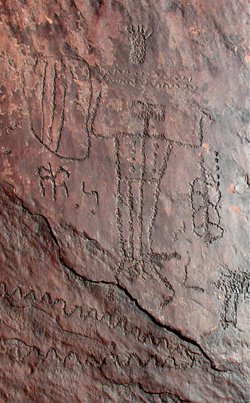 Southern Utah panel which appears to depict the rain god with a corn plant on his right and an early maize cob on his left.